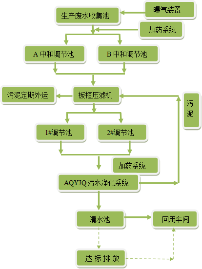 AQYJQ系统处理污水时,采用多种处理药剂及其最佳配方组合使用,靠化学反应针对性使污水中溶解状态的有机污染物、金属离子和有害的盐类等物质从水中析出,成为有固相界面的微小颗粒(它包含有污水三级精细处理的作用)。其中还选用了一种吸附效果很好而价钱又很便宜的吸附剂,以吸附有机污染物、油脂和色度。靠混凝的物理化学吸附作用将悬浮物及各类杂质凝聚成大而密实的絮团,然后通过系统自身流体理学的作用过滤后出水的悬浮物低于10毫克/升(浊度:<30NTU),完全达到车间粗清洗工艺的用水水质要求,一部分出水可以用于粗清洗,同时一部分出水达到广东省地方标准《水污染排放限值》(DB44/26-2001)一级标准(第二时段)进行排放。
